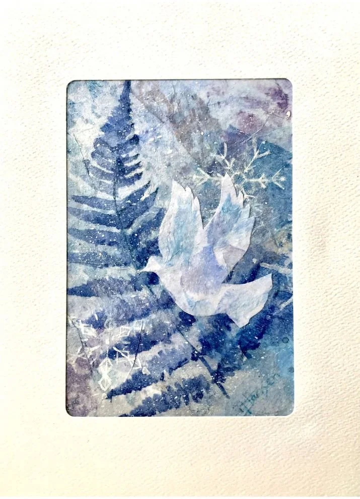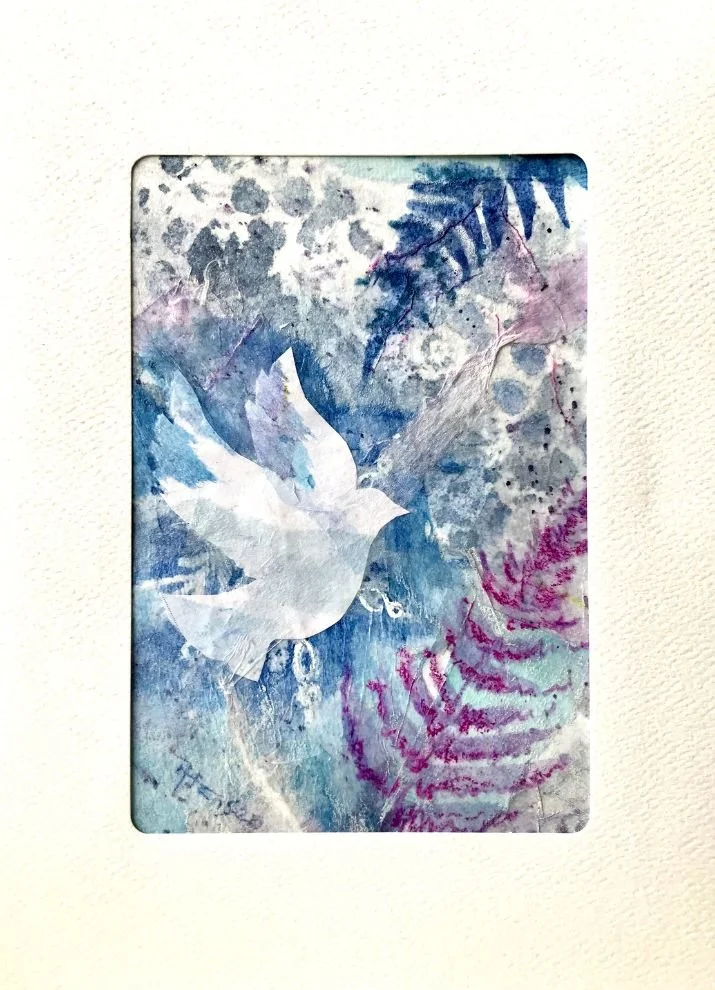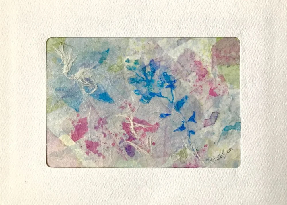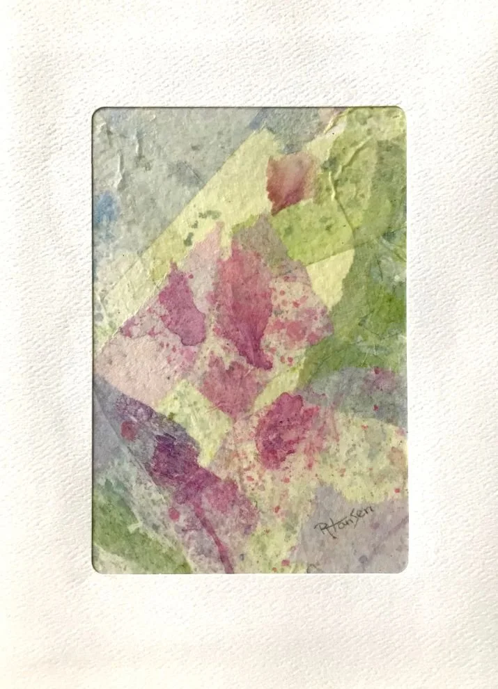 Blank note art cards are original watercolor and mixed media collage made with hand tinted papers. These beautiful one of a kind paintings have been sealed with satin varnish and are presented in Strathmore photo frame cards. After being received as a greeting they are ready for display in standard 5 x 7” tabletop or wall mounted frames. Cards cost $15.00 each and come with a white envelope sealed in a protective cellophane bag. Card dimensions: 5 x 6 7/8”; frame opening: 3 1/8 x 4 5/8”